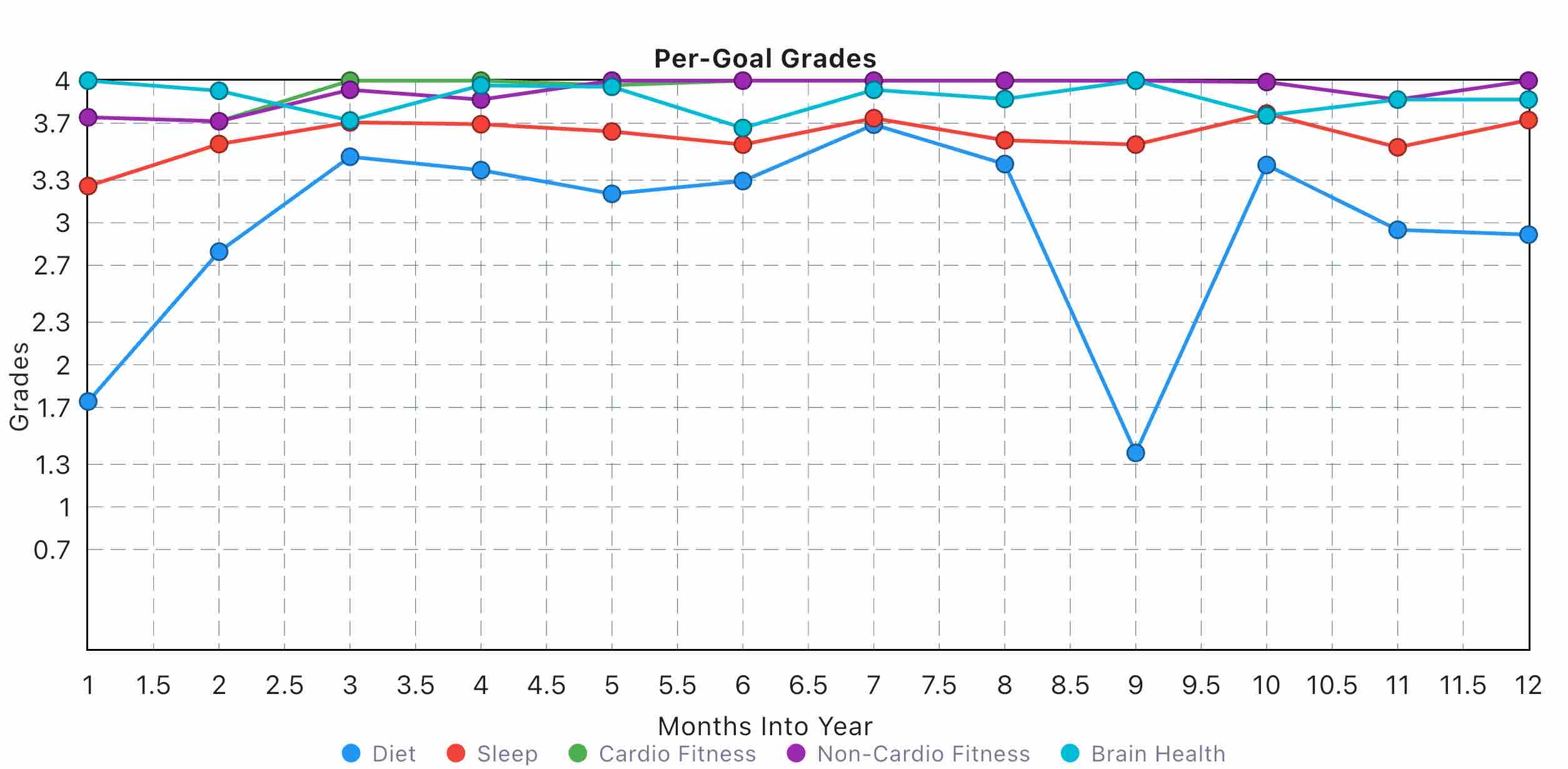 The overall GPA of 3.66 is the highest I’ve ever hit, just barely edging out the previous high score from 2024. Cardio fitness, non-cardio fitness, and brain health goals also logged the best scores to date as well. Sleep, while not at the A level still had the third highest level. While diet took a bit of a ding compared to last year and dropped from B to B- was also still the third highest score for that grade.