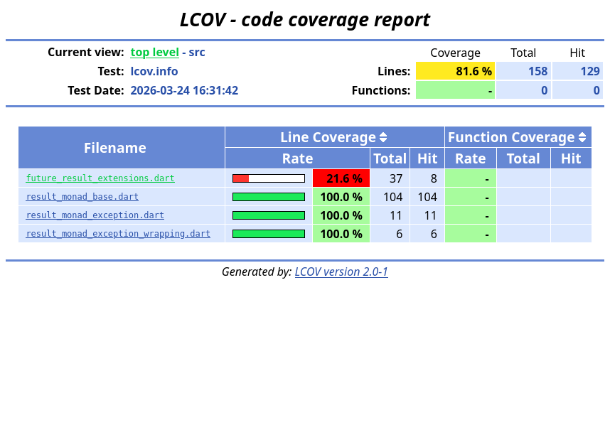I like having some estimate of how good my unit tests are covering my code. That is especially true for libraries I publish for others to use. I’m making some updates and upgrades to my Dart Result Monad library . I had to dust off my knowledge of doing code coverage in Dart since it had been awhile. It is relatively straightforward to generate these statistics for your Dart and Flutter projects using a couple of tools found in the pub.dev ecosystem. However it took me a couple of trial and error iterations to get the cobwebs out. So I decided to document it here.
